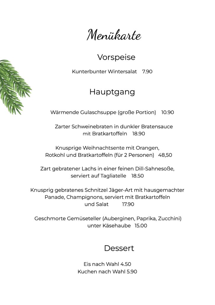 wir nehmen Ihre Reservierung für die Weihnachtsfeier – Menü oder Buffet (35 Euro pro Person inkl Bier und Softgetränke) gerne an.